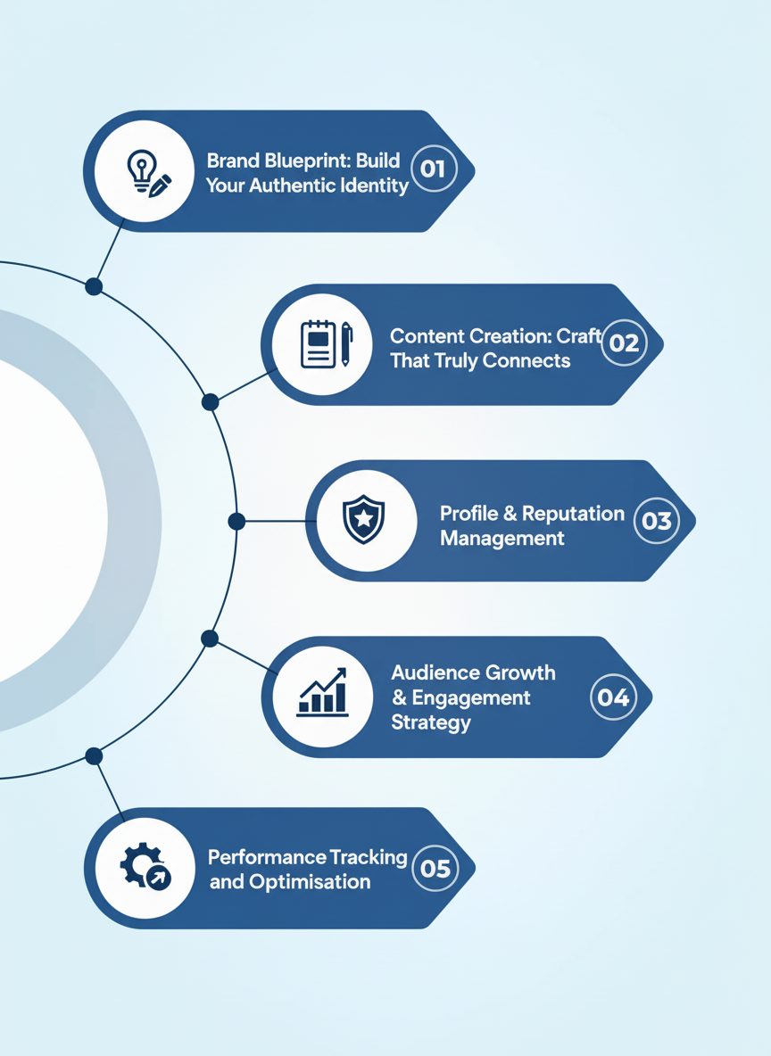 Every strategy is aligned with your expertise, audience expectations, and long-term goals. Our personal branding experts ensure consistency across every touchpoint.